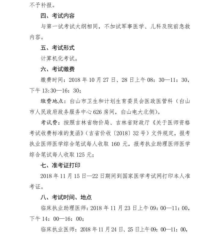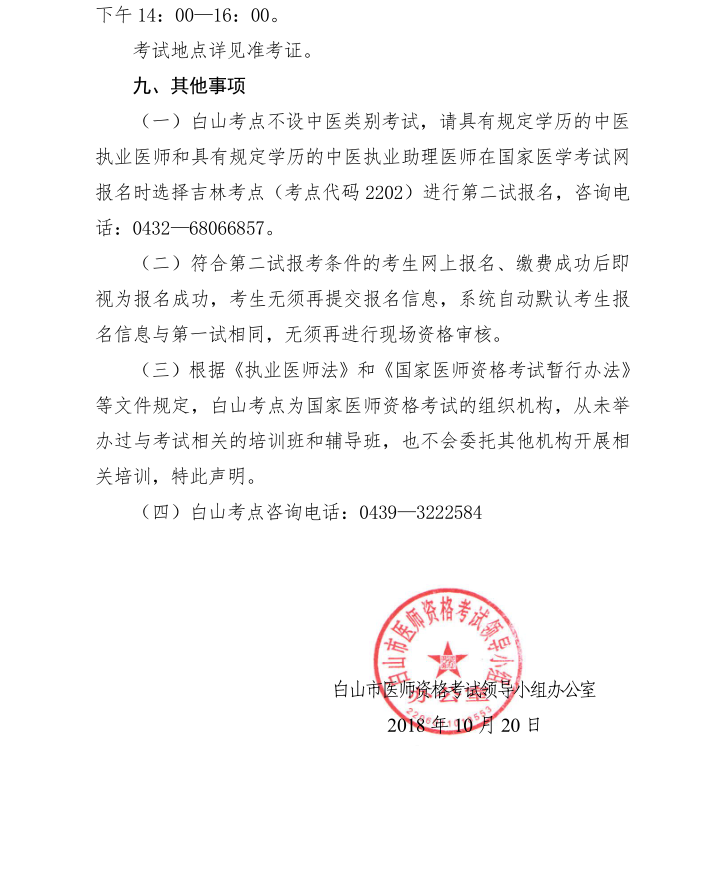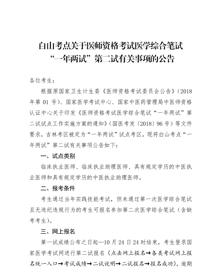 白山考点关于医师资格考试医学综合笔试“一年两试”第二试有关事项的公告