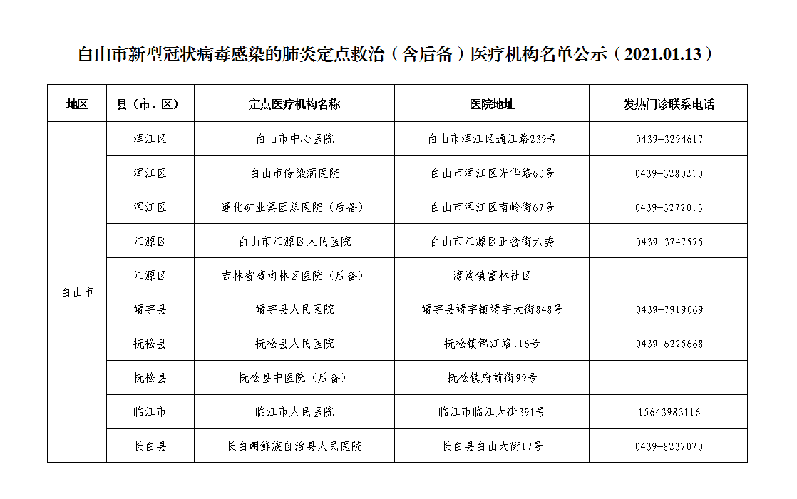 白山市新型冠状病毒感染的肺炎定点救治(含后备)医疗机构名单公示(2021.01.13)