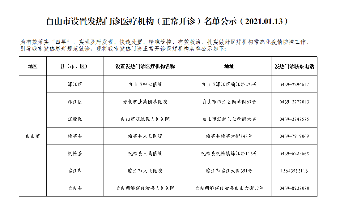 白山市设置发热门诊医疗机构(正常开诊)名单公示(2021.01.13)