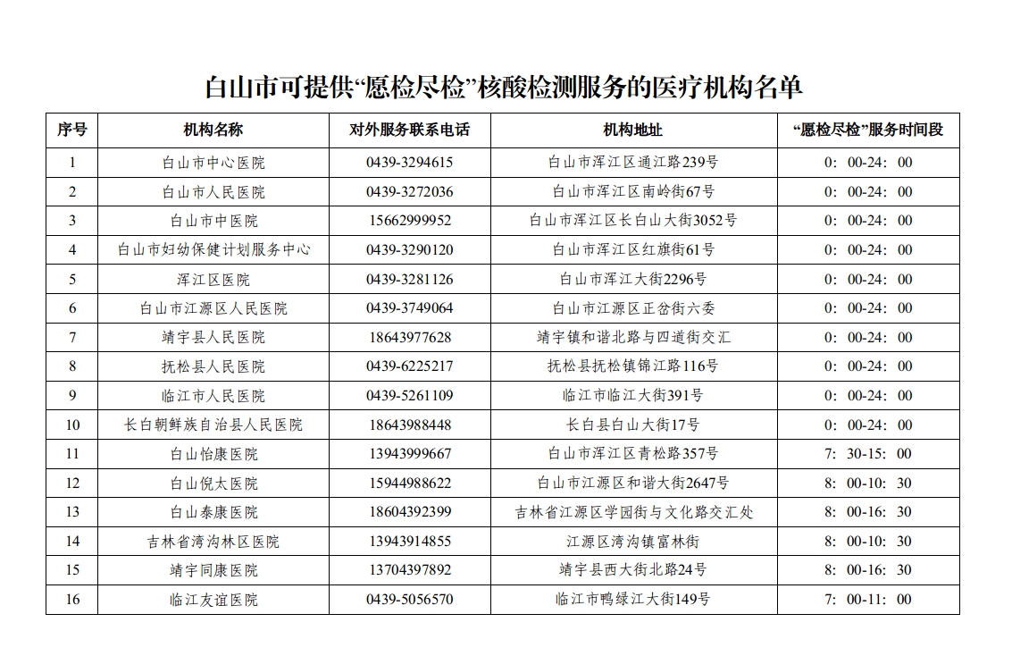 白山市可提供“愿检尽检”核酸检测服务的机构名单