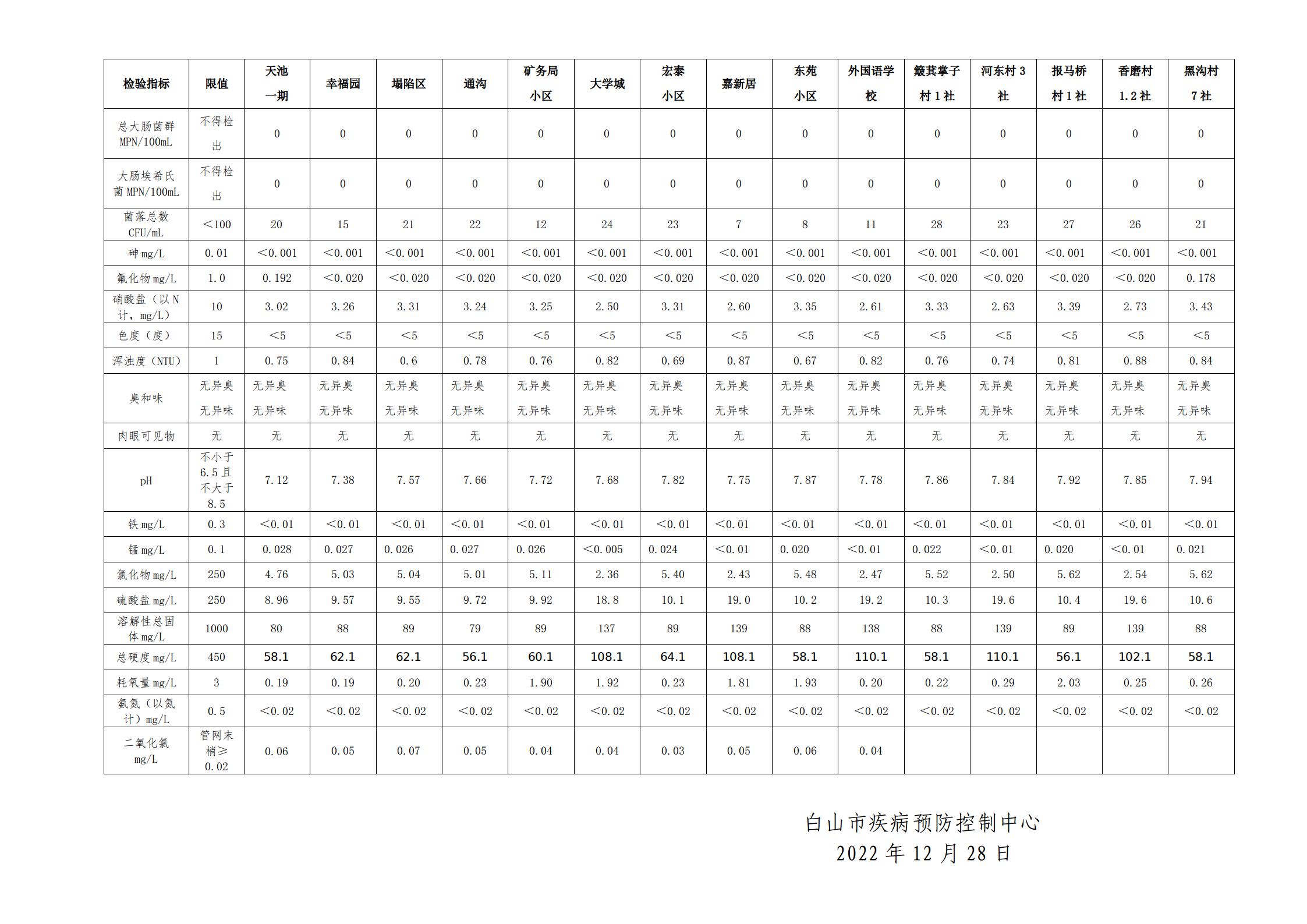 白山市浑江区2022年第四季度城市生活饮用水监测结果公示